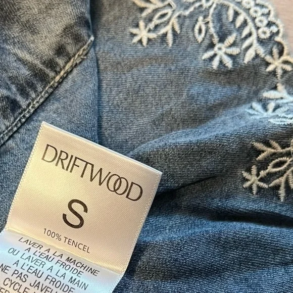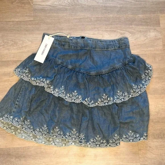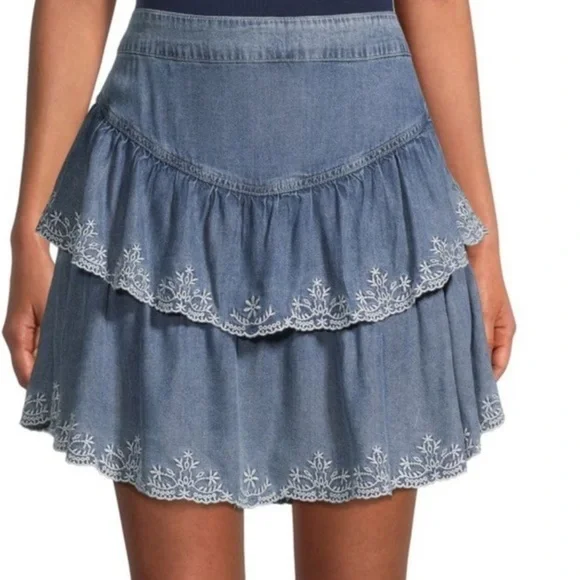 Driftwood Chambray Embroidered Eyelet Ruffle Skirt, size S NWTConstructed from a chambray fabric, this mini skirt is finished with a ruffle hem and delicate eyelet embroidery.• Concealed back zip• Ruffle hem• Tencel lyocell material • Machine washApprox measurements (laying flat):Waist: 14”Length: 17”NWT Driftwood Chambray Embroidered Eyelet Ruffle Skirt, blue, size Small