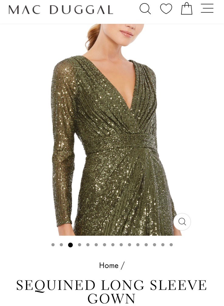 Long sleeved fully sequined evening gown accented with a ruched waist and thigh-high front slit.