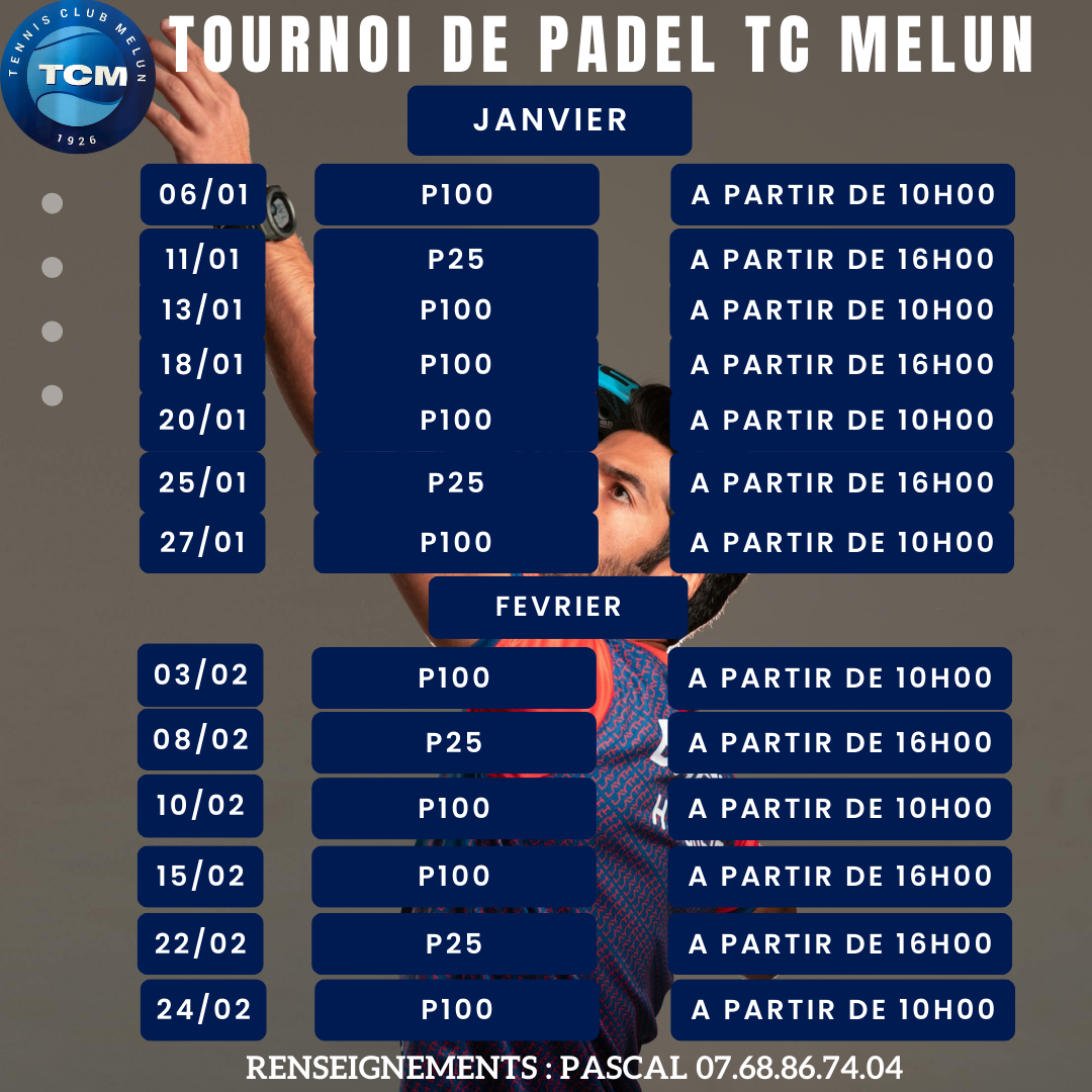 Ici, vous trouverez la liste de nos tournois de Padel pour Janvier et Février.