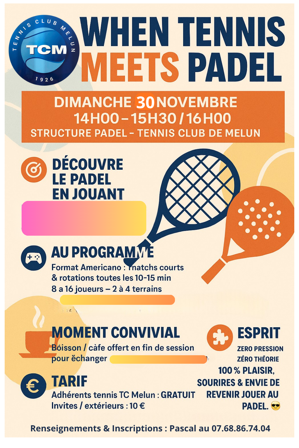 Tu joues au tennis au TCM et tu as envie de tester le padel sans prise de tête ? On te propose une session 100 % jeu :
